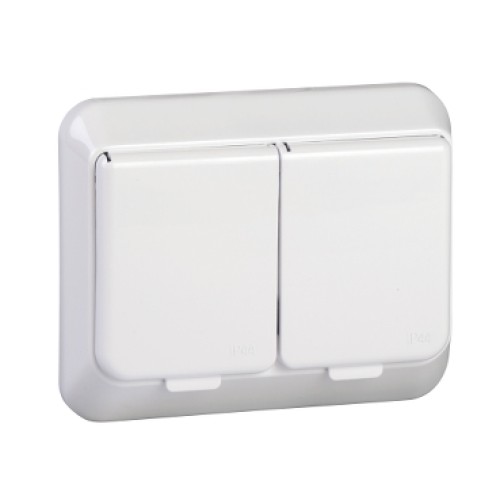 WDE008249 dvigub. kištukinis lizdas, 2P + E, 16A, „Schuko“, dangtelis, su sklende, varžtas, IP44, baltas, Exxact